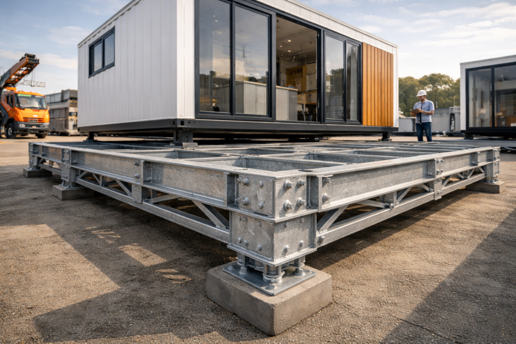 O chassi funciona como a base estrutural sobre a qual todos os sistemas de um módulo habitacional se assentam. Trata-se de uma estrutura metálica robusta, projetada para suportar cargas significativas e distribuir o peso de forma equilibrada. Essa infraestrutura é responsável por garantir a estabilidade do módulo durante o transporte, montagem e uso permanente.